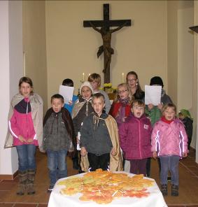 „Martin und die Gänse“ - so lautete das kleine Anspiel, welches Kinder aus Ditterswind, Gresselgrund und Marbach einstudiert hatten, um es beim St. Martins-Fest in der Kirche zu präsentieren. Die Geschichte handelt vom heiligen Martin, der sich weigert, zum Bischof ernannt zu werden; doch die Gänse verraten lautstark sein Versteck. „Martin ist einer, der nicht wollte, aber doch konnte; er traut sich nicht, aber viele trauen es ihm zu“, so Pfarrer Scheidel bei seiner Ansprache. Nach dem Eingangslied „Sankt Martin ritt durch Schnee und Wind“ erfreuten die Kinder die zahlreich erschienenen Besucher mit der oben genannten Episode aus dem Leben des Martin von Tours. Im Anschluss an die kleine Feierstunde zogen die Kinder mit ihren leuchtenden Laternen durchs Dorf, sangen an ausgewählten Plätzen die bekannten Martinslieder und trafen schließlich am Dorfplatz ein, wo bereits Glühwein, Kinderpunsch, Wiener Würstchen, Kuchen und so manche andere Leckerei auf Groß und Klein warteten. - Unser Bild zeigt die Kinderschar beim Sankt-Martins-Lied in der Kirche. Text und Foto: Jens Fertinger |